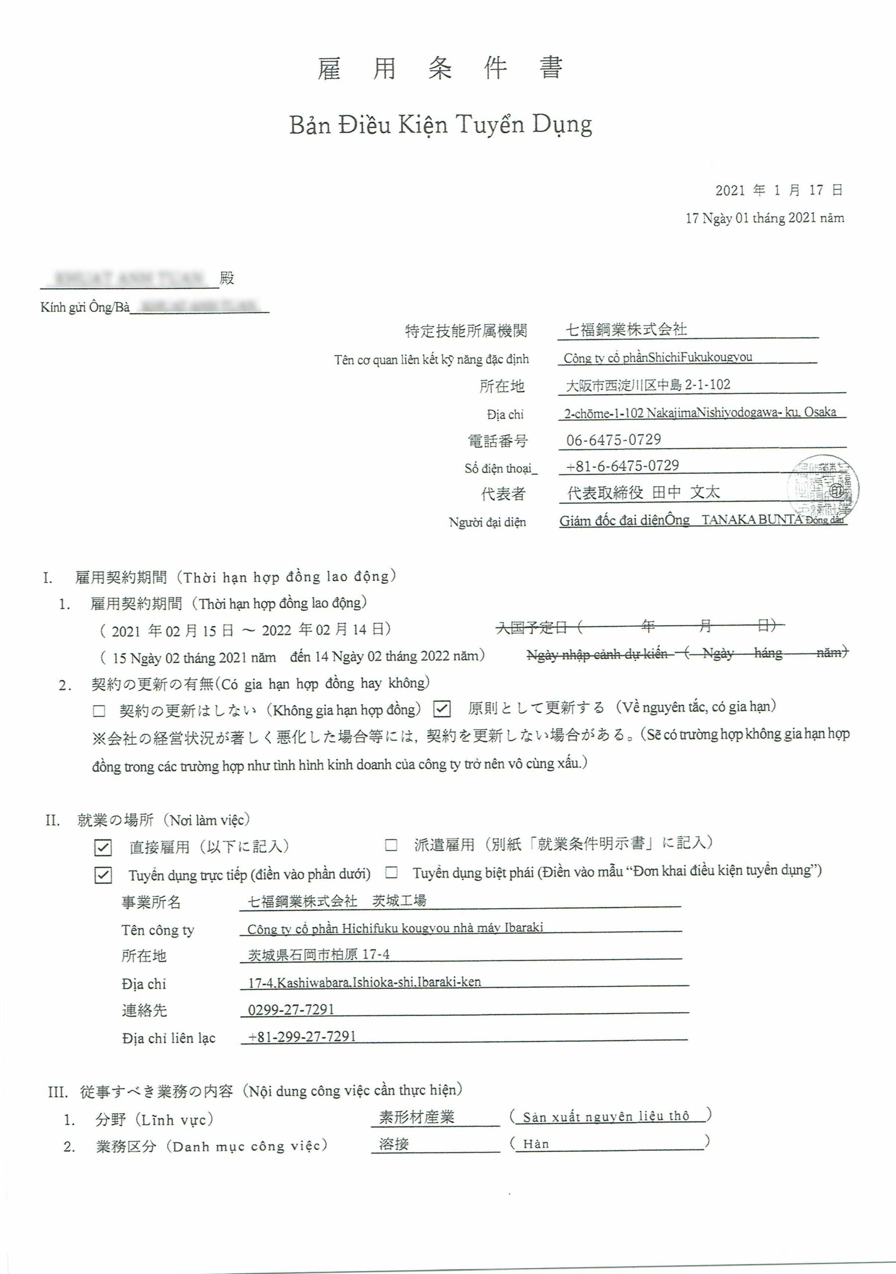 雇用条件書(こようけいやくしょ) *Bắt buộc